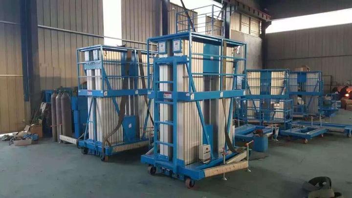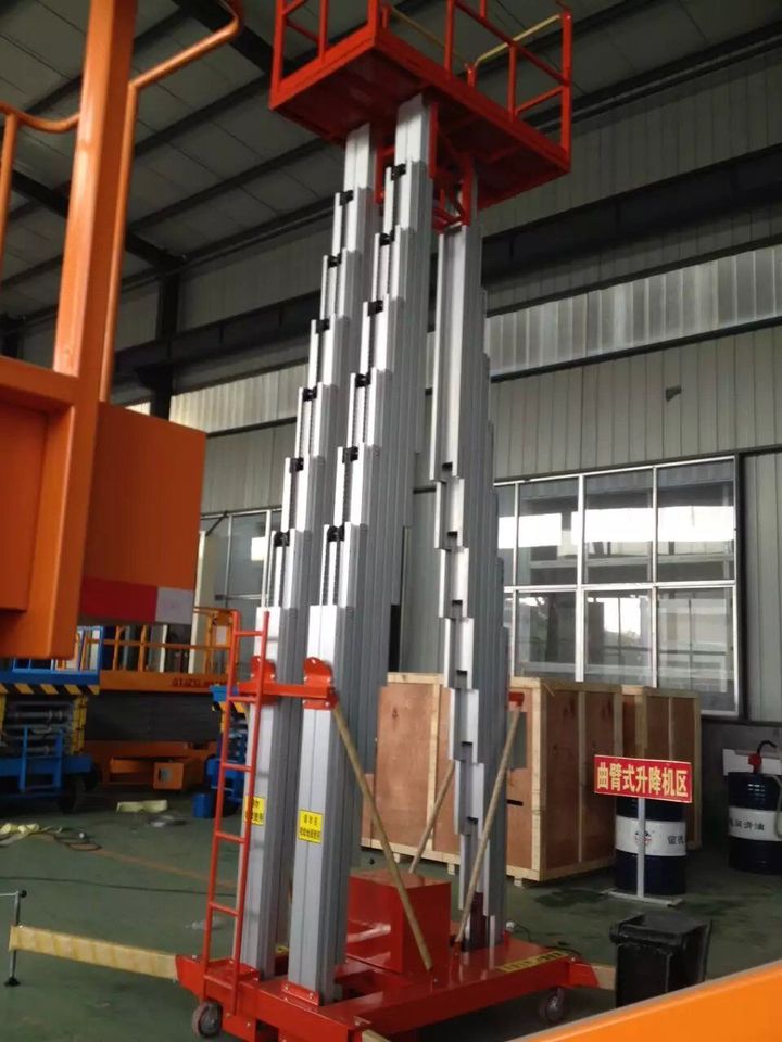 鋁合金升降機(jī):該係列產(chǎn)品為室內型,廣泛適用於星級酒店,大型超市等各行業大廳、廠房內的高空(kōng)作(zuò)業, 具有升降平衡,操作方便,能進入(rù)一(yī)般門廳,可隨意進出電(diàn)梯且耗電(diàn)少、無汙染、工作時不傷 地麵,可用於貼(tiē)牆工作及探出(chū)作業,工作無(wú)死角。單立(lì)柱式(shì)鋁合金電(diàn)動升降機配(pèi)上龍門跨架附件,非常適合於影(yǐng)劇(jù)院(yuàn)、會堂、體(tǐ)育館等場所的高空維修保潔工作。鋁合金升降機龍門(mén)跨架組裝容易,操作省力,移動靈活,可跨越(yuè)高度(dù)達1.1m的固定座椅等障礙物,並可在台階上穩定 作業。 高強度矩形(xíng)鋼管製作, 剛性、穩定性好。 配有萬向腳輪,機動靈活。 兩端(duān)架(jià)跨距可調,能適 用於(yú)跨越不同障礙物的要求。 兩端架垂直可調,可用於一定坡度的斜麵或台階上作業(yè)。雙柱鋁合金升降機(jī):全新設計的新一代產品,整體(tǐ)采用高強度(dù)鋁型材精製而成由於型材強度高,使升(shēng)降(jiàng)台的偏轉與擺動極小。采用雙桅柱式結構,載重量大’平台(tái)麵積大,穩定性極(jí)好,運轉靈活,推行方便。
