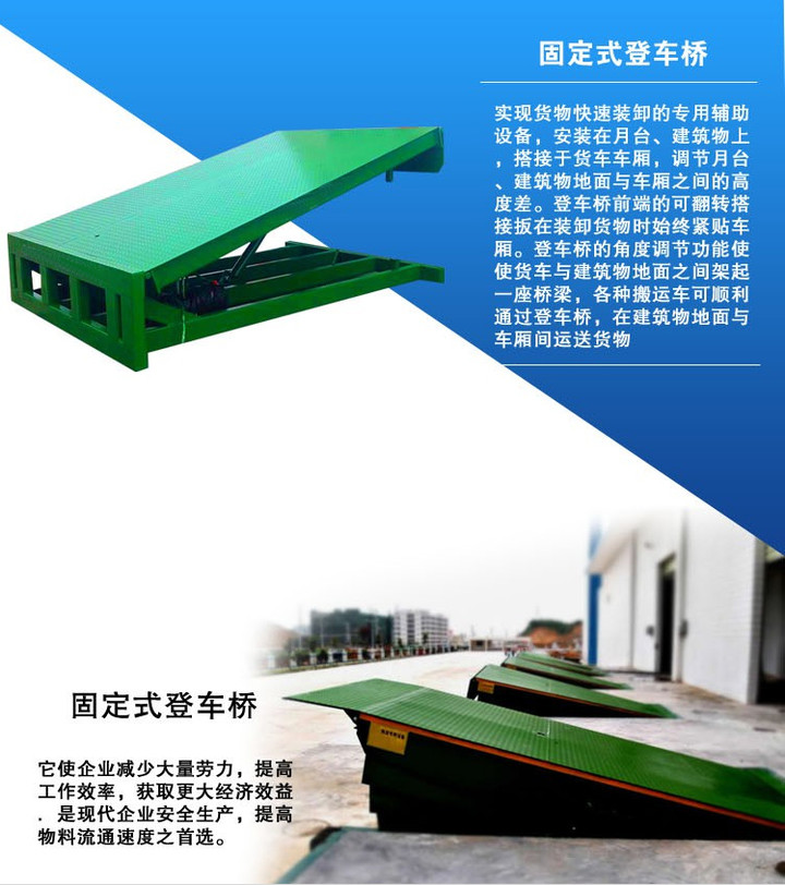 產品可根據(jù)用戶(hù)的不(bú)同需要(yào),廣泛應用於碼頭、站台、倉庫等地。在外形尺寸,承(chéng)受載(zǎi)荷等方麵都可以作特殊設(shè)計。 固定式登車橋www.netlk.com安裝(zhuāng)在貨台的側麵,與貨台(tái)地麵和側麵齊平。固定式登車橋的橋板可(kě)上、下傾斜,其(qí)外端可高出或低於貨台平麵,使之與車廂等高。橋板的頂端有一翻板,自動搭在車廂(xiāng)邊緣,使貨台(tái)與車廂平穩過渡。