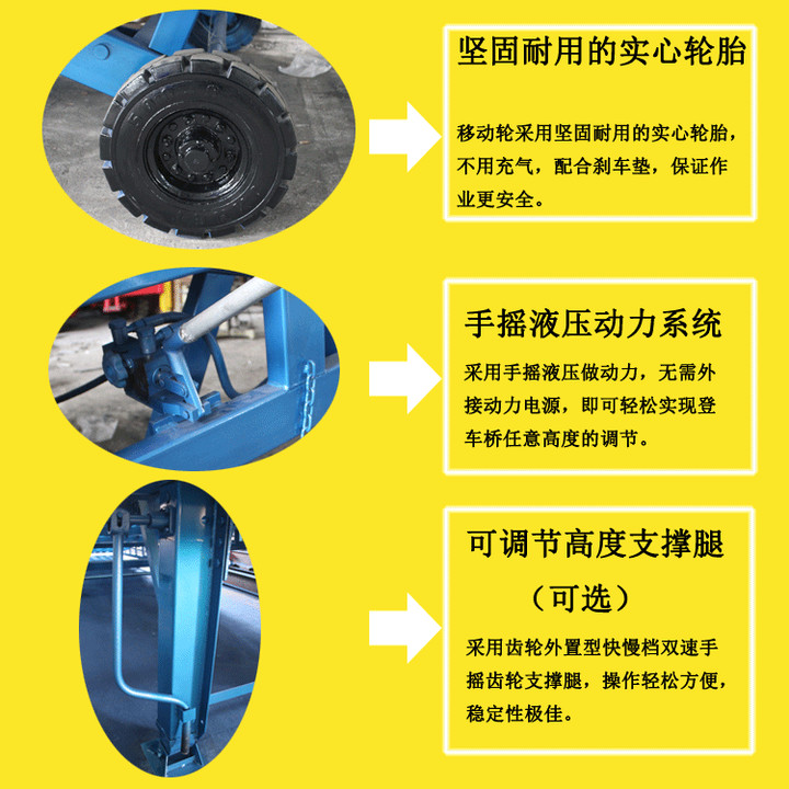 三、采用手搖液壓泵作(zuò)動力,勿需外接動力電(diàn)源即(jí)可(kě)輕鬆(sōng)實現登車橋的高度調節。